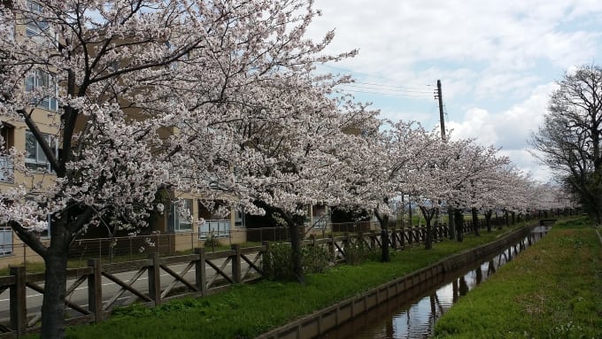 Cherry blossoms lining a small road and river